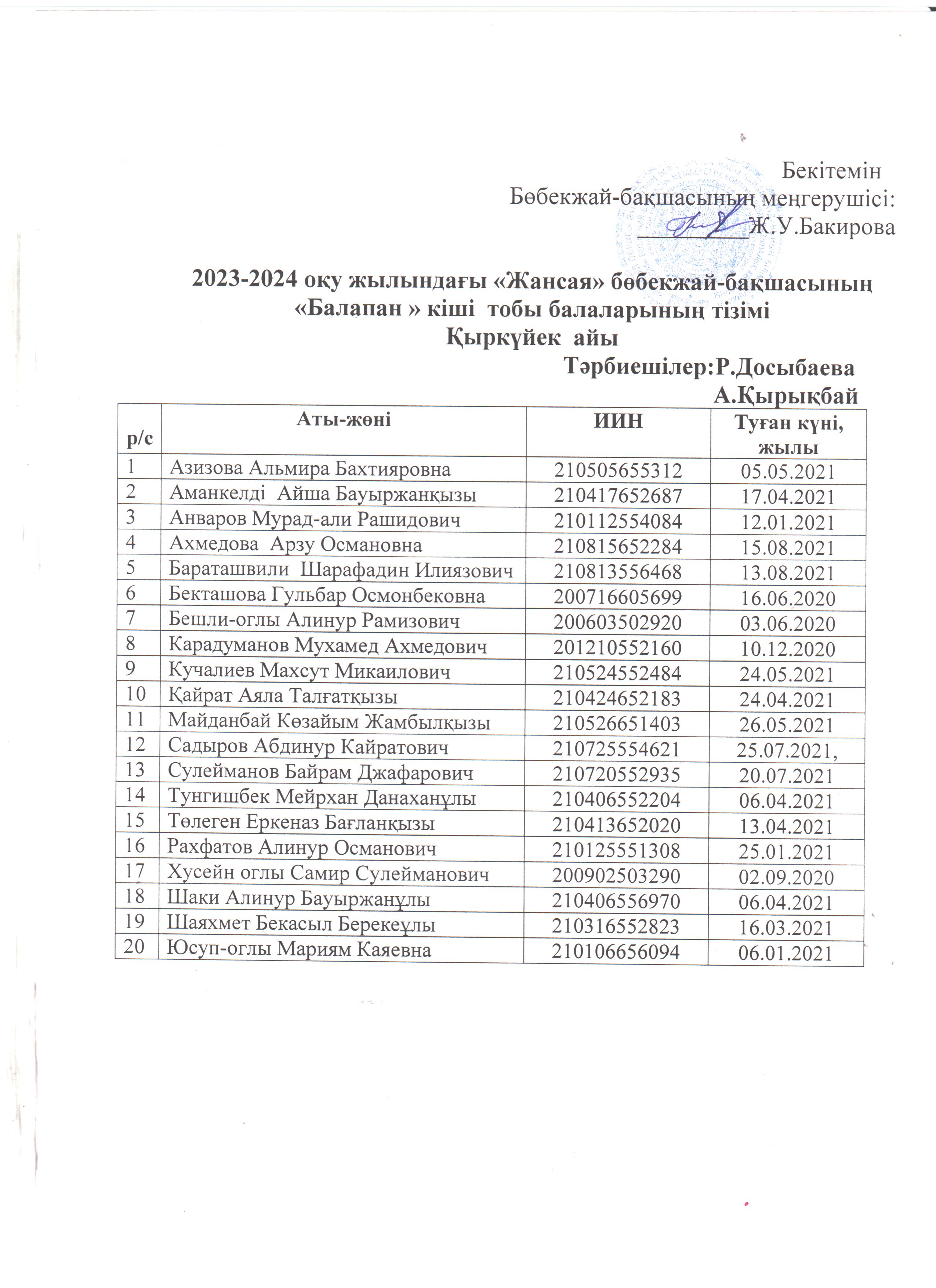 "Балапан" ІІ кіші топ балаларының тізімі.