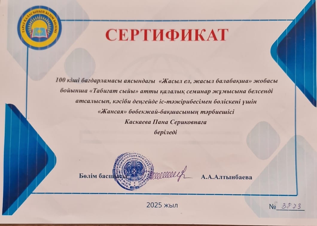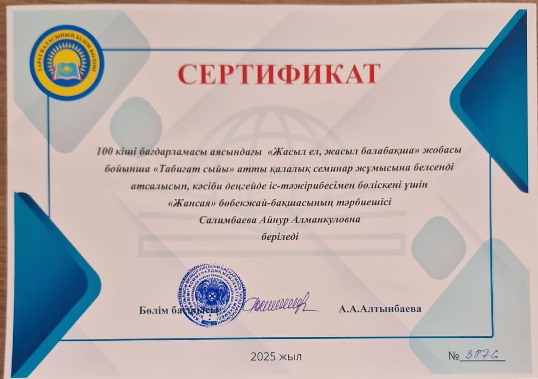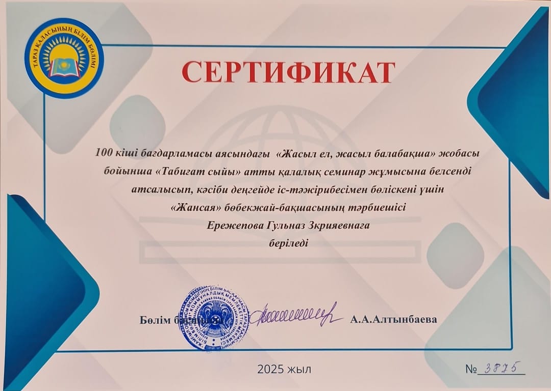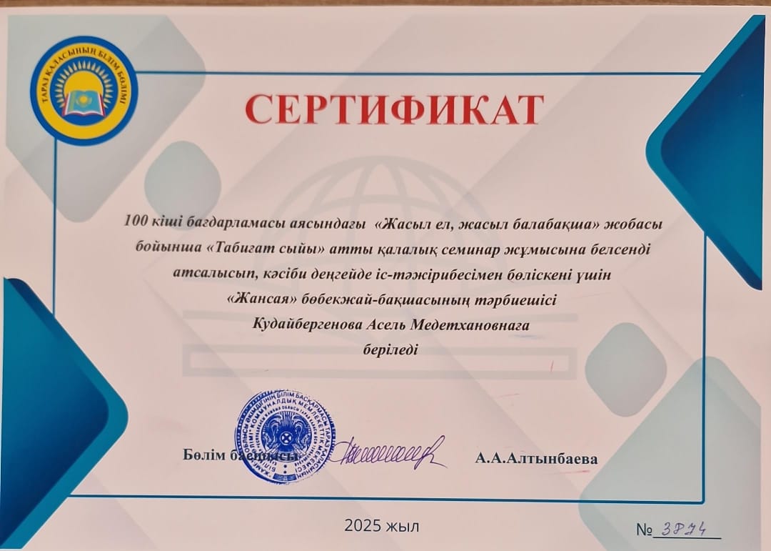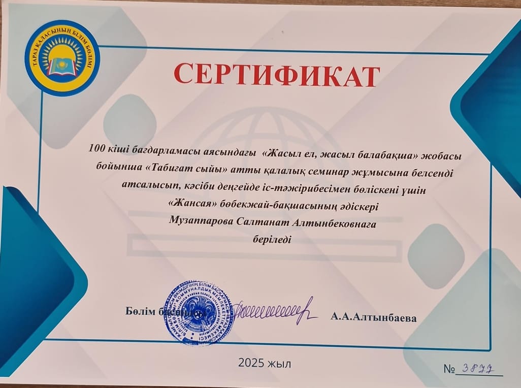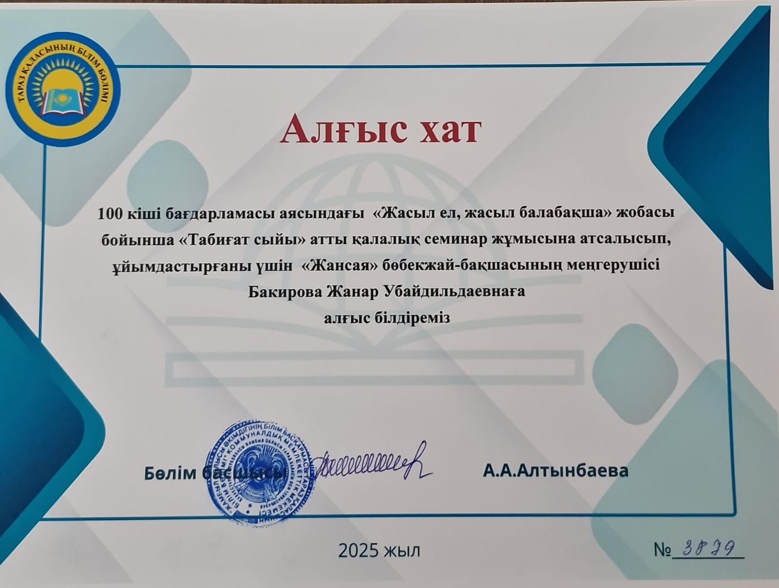 30 октябрь 2025 0 1 2 3 4 5 Жетістіктеріміз "Жансая" бөбекжай-бақшасы 100 кіші бағдарламасы аясындағы "Жасыл ел,жасыл балабақша" жобасы бойынша "Табиғат сыйы"атты қалалық семинарға белсене атсалысып кәсіби деңгейде іс- тәжірибесімен бөліскені үшін Алғыс хат,Сертефикаттармен марапатталды