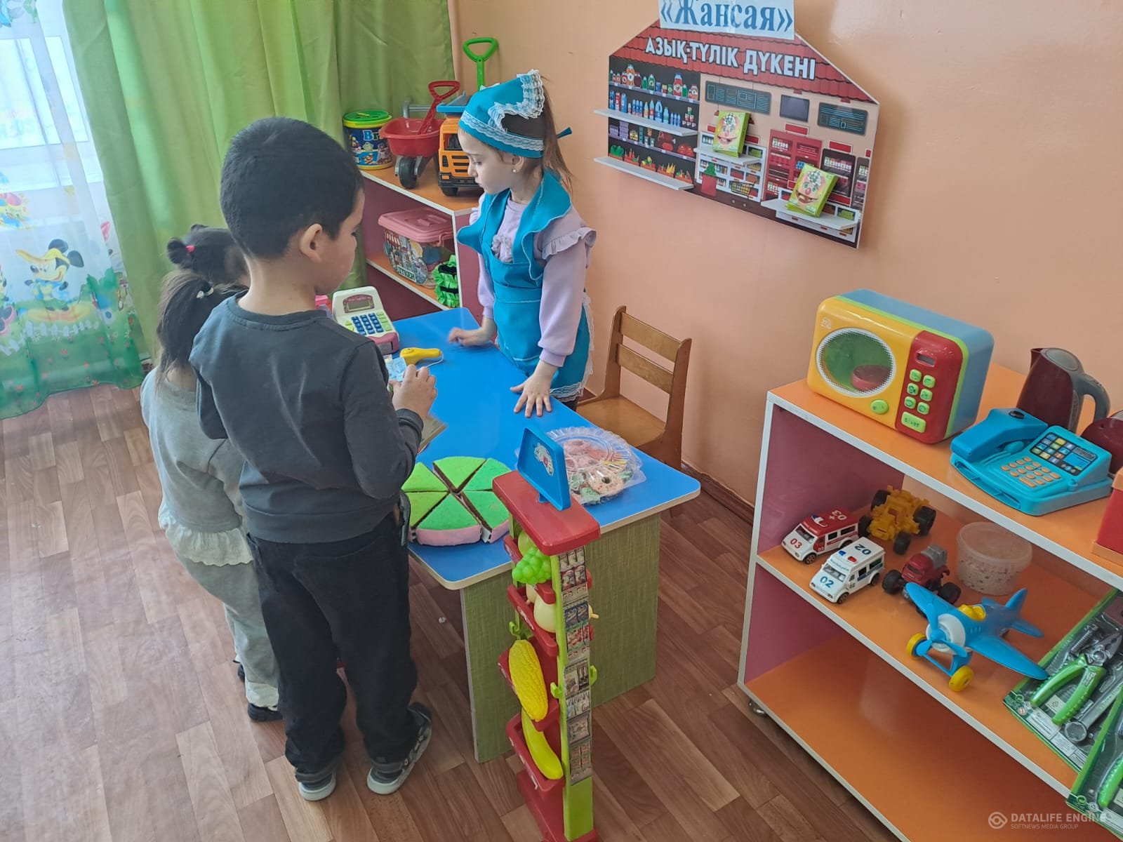 Міндеті:Балалардың сюжеттік-рөлдік ойын арқылы сөйлеу жане коммуникативтік дағдыларын дамыту.Телестудияда, дүкенде, дәріханада жұмыс жасайтын маман иелерін таныстыру. Балалардың диалогтық қарым қатынасын жане көпшілік алдында еркін сөйлеу дағдыларын жетілдіру.