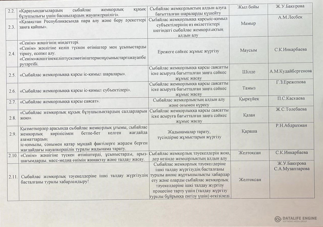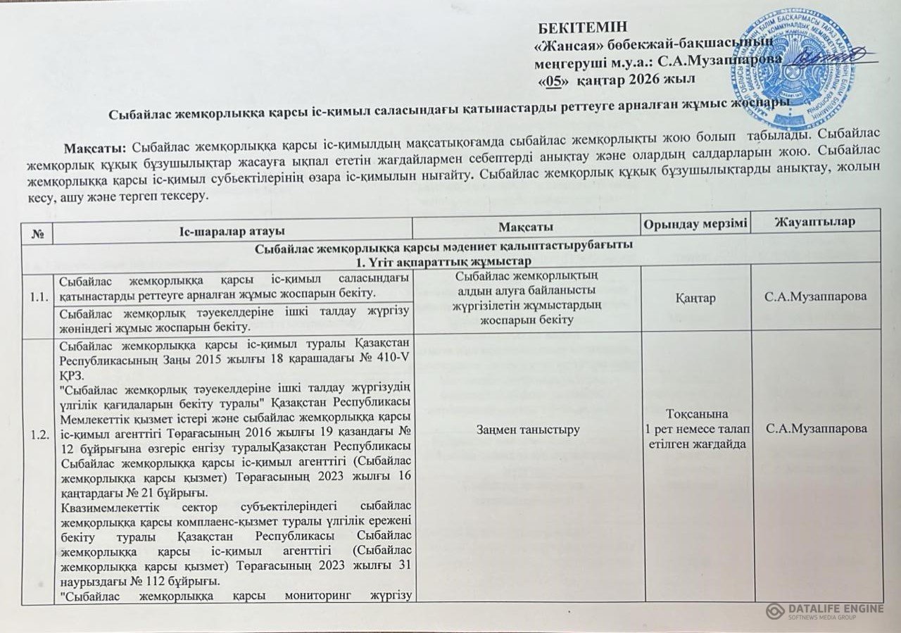 05 январь 2026 0 1 2 3 4 5 Сыбайлас жемқорлыққа қарсы іс-қимыл саласындағы қатынастарды реттеуге арналған жұмыс жоспары